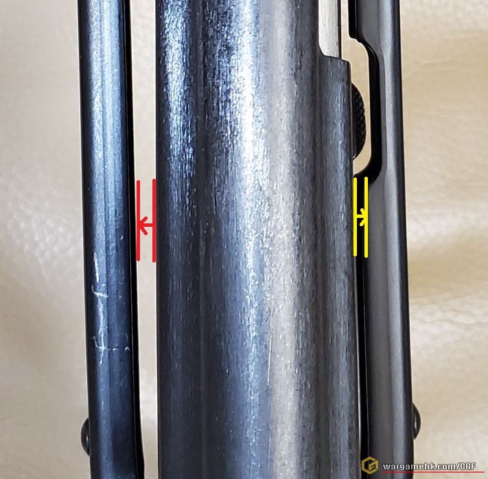摺托同槍身之間距離,左邊條罅 (紅色) 明顯闊過右邊條罅 (黃色)!![]()