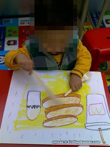 囝囝:..嗚嗚.........媽媽呀...老師要我地畫熱香餅,漢堡包..仲要黑椒果種...仲有好多好多路其他既野食呀....老師佢佢望住我地 ...