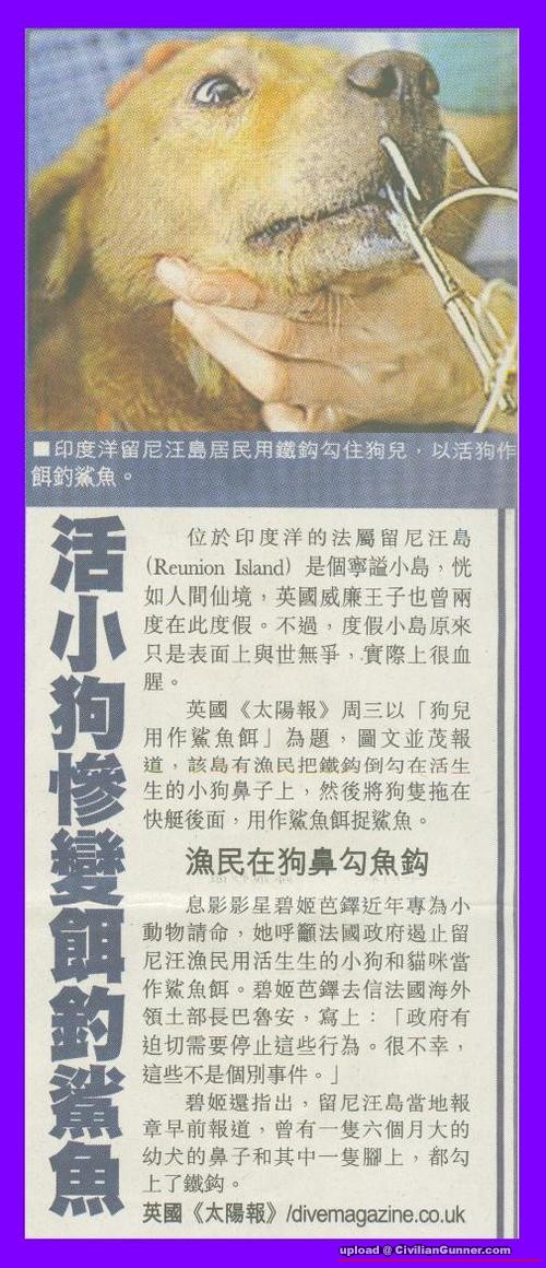 原帖由 魚膠粉` 於 5-11-2010 11:03 PM 發表 癡線ga.. 無啦啦甘樣用狗黎做魚餌 好無人性.. 又唔見佢落去引d鯊魚過黎..