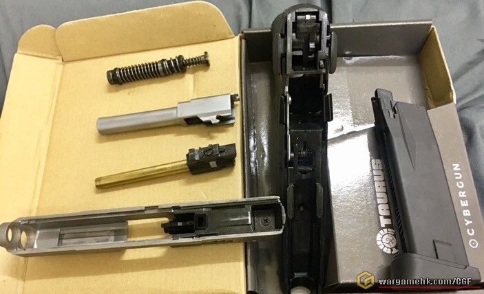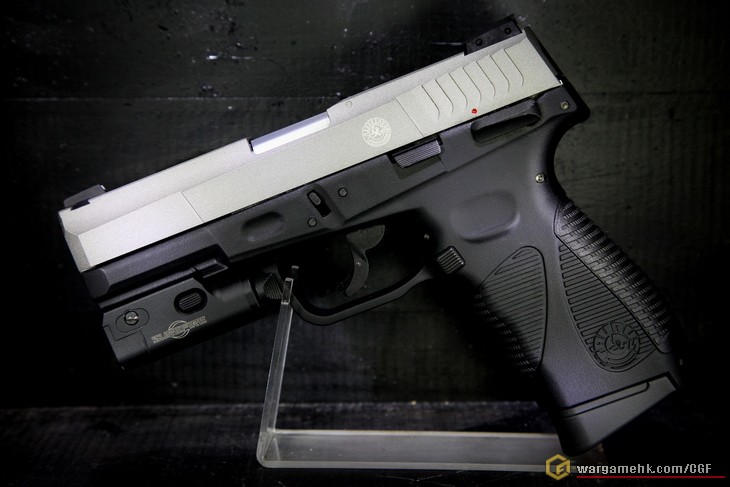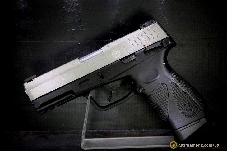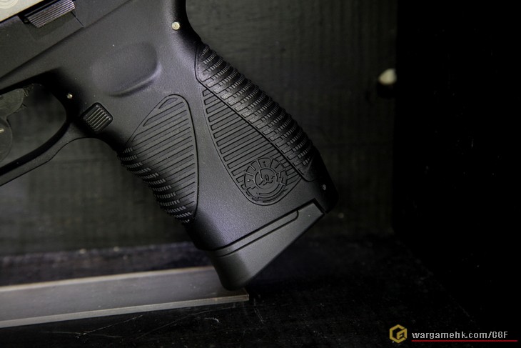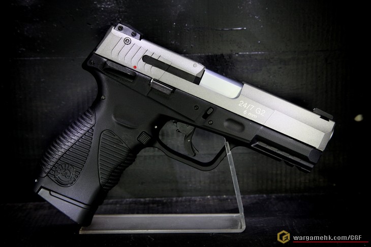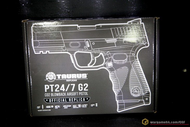 Cybergun近年在Co2槍市場上頗進取的, 先後出了很多特別款式的手槍, 這次的"Taurus PT24/7 G2"也是其中之一. 今天在"天糖"以(#)入手. 其實從包裝已經看得出是"Cybergun"的出品了........灰色盒子印上槍支外觀, 已成為他們的標誌, 盒內除了槍支本體, 另外還有可更換的握把片兩塊, 分別是"S"及"L"供選擇. 滑套上的刻印應該是鐳刻的, 握把上的金年座標誌非常仔細, Slide Stop, Magazine Release及Safety也是左右手可用, 這差不多是現代手槍的標準配置, 彈匣為正常尺寸, 不再是幼幼的彈匣, 裝彈數為19發6mm. 測試過一瓶Co2可射6個彈匣的彈數, 十分省氣, 試射手感不錯, 非常硬的回鏜彈弓, 用上Co2推動, 令Blowback強勁紮實, 射擊力度方面, 大約是1.5J. 這支"Taurus PT24/7 G2"可說是我近期比較滿意的一支Co2手槍
