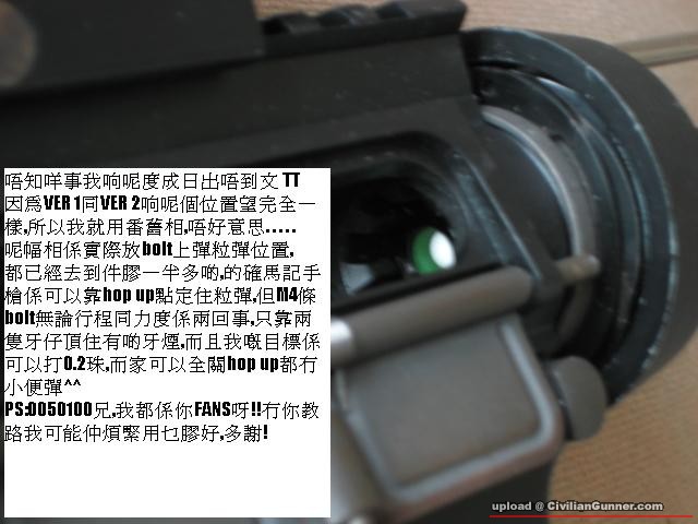 樓主,其實我有留意開你個hop up改既post,我也重復做了一次,因事前準備不足所以失敗收場,晒了百幾蚊粒奶波廠出的紫色膠!回正題我返覆做了test之後都係樓主你個設計係最好,之前有C兄都好像你改但他不用鑽孔,但我又跟他做了一次發覺氣密好差,他說你的設計BB彈會頂過龍,但其實這粒膠的頭段孔位很大,氣嘴推上去周邊同粒膠內圓跟本就有空隙,所以我念過你的設計係最正確,只要粒BB唔過粒膠裡面中間特起的邊位就無事,其實我手頭有支KJW M4正正就係咁既設計,所以KJW m4的hop up其實係眾多GBB m4係最可靠,由於KJW M4GBB 的bolt 設計就係把手鎗的設計放大!