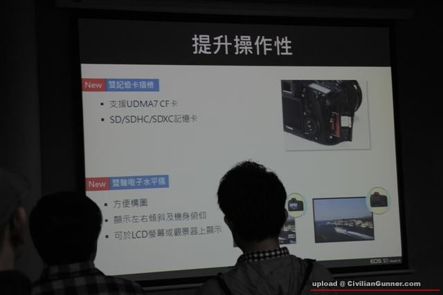 機身更內置雙軸電子水平儀,於風景拍攝時方便攝影師更精確校準水平。EOS 5D Mark III採用了雙記憶卡插糟設計,同時支援CF記憶卡(對應UDMA 7)及SD記憶卡(對應SD/ SDHC/ SDXC),帶來更具彈性的儲存方案。