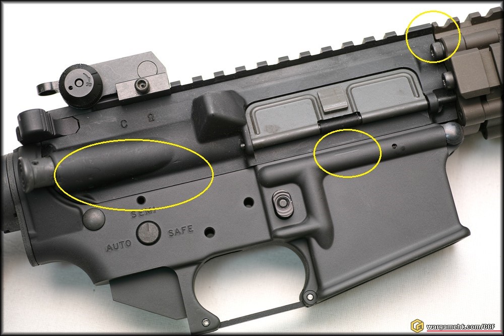 1.  UPPER是真的: 槍機助進倉的鍛胎記及接合RIS II的隙縫, 這些缺憾相對地出現在AIRSOFT產品上, 現今的客人是無法接受的, 原因是付出的金額價值這麼高, 竟然不是完美級別!! 但事實上真正的槍械確實是這個模樣, 特別是與一體化戰術路軌的無縫接合要求, 只是在AIRSOFT界才會出現.