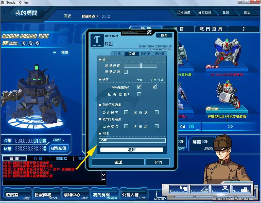 原帖由 bonwin 於 15-8-2009 01:14 發表 各位會唔會係game 名後加簽名 [CGF] 以作識別 設置果度有得set 簽名