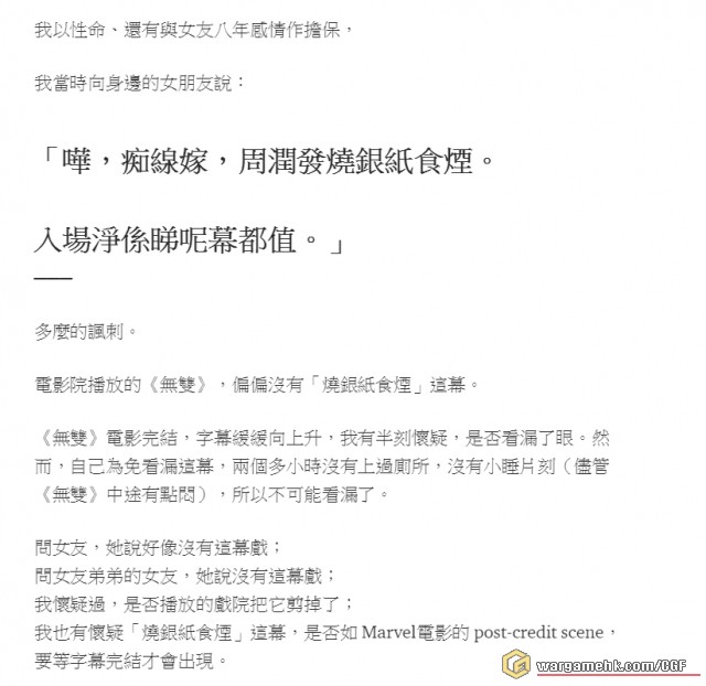 ¥v¥S«ã¹D¡G¡u§Q¥Î³o¤£¦s¦bªº¤@¹õ¡A¥h´ÛÄF©Ò¦³¹ï¡m^¶¯¥»¦â¡n¡X¡X¯S§O¡y¿N»È¯È¹·Ï¡z¡Ð¦³·P±¡ªº¤H¡A¤J³õÆ[¬Ý¡mµLÂù¡n¡C±q³oÆ[ÂI¥Xµo¡A«Å¶Ç¤ù¬O¦¨¥\ªº¡C³Ì°_½X¡A§Ú³QÄF¤F¤J³õ¡C¡v¦ý¤]¦³ºô¥Á¯d¨¥¡G¡uMarvel¹w§i¤ù³£¦n¦h«Y¬y¡C¡v¡B¡u¨ä¹êªñ¦~²ü¨½¬¡¹q¼v³£¦¨¤é¥X²{µe±¥u¹w§i¤ù¤¤¥X²{¡]¦p¬P¾Ô«e¶ÇÆ¿´_¤³ªÌÁp·ù3¡^¡v¥ç¦³¤H¯d¨¥¡G¡u¥h³ø®üÃö¡y°Ó«~»¡©ú±ø¨Ò¡z¡A§Ú¤ä«ù§A¡C¡v