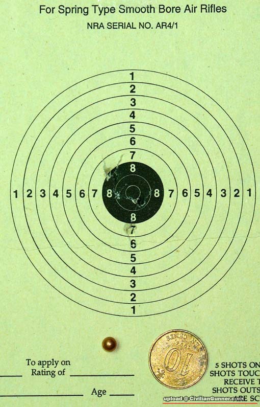 夾硬low底至1.9j打0.56g鉛彈時初速會太底得2xx fps.........,唯有打鋼珠(0.35g),1.95j初速上限可以有330fps.這初速打手鎗靶勉强還可以,但打步鎗靶仍然不足,而且打鋼珠粒彈唔夠密氣、行唔到來福線、又無hop up,故準極有限,況且打鋼珠一定不能打出一個個完整的圓孔................所以2j以下嘅4.5mm(0.177吋) air gun 打鋼珠很難打到合格嘅ISSF 10M 靶...................