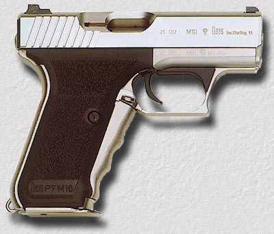 | P7手槍在槍膛的20mm處(在子彈上膛後彈殼的前緣處)有一瓦斯導管導入與槍管平行的瓦斯缸中,而手槍滑套則聯結著活塞置入瓦斯缸中,一般利用發射藥瓦斯來驅動槍枝機械裝置多截取低壓瓦斯,P7手槍使用高壓瓦斯驅動則是非常前衛大膽的設計 ,好在9mm Parabellum子彈的膛壓不大。當子彈在P7手槍的槍膛中被擊發後,發射藥燃燒所產生的高壓瓦斯除用來推動彈頭,並由瓦斯導管導入瓦斯缸中,高壓瓦斯會頂住活塞,而活塞與滑套連結,這使滑套與槍膛扺緊達到閉鎖的效果,當彈頭射出槍管後,產生的後座力(此時瓦斯缸中壓力降低)使滑套後移完成拋殼與上膛程序。正因為有種閉鎖裝置,使P7手 | ![]() P7M10 |