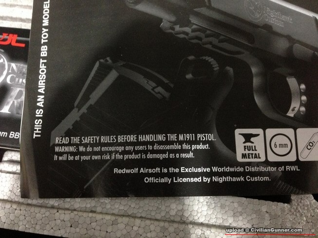 槍身marking係鐳刻,刻得很淺,一邊係Nighthawk Custom,一邊係RWL及流水碼,另近槍咀位有Cal 6mm marking (睇唔過眼比我Blue黑左).