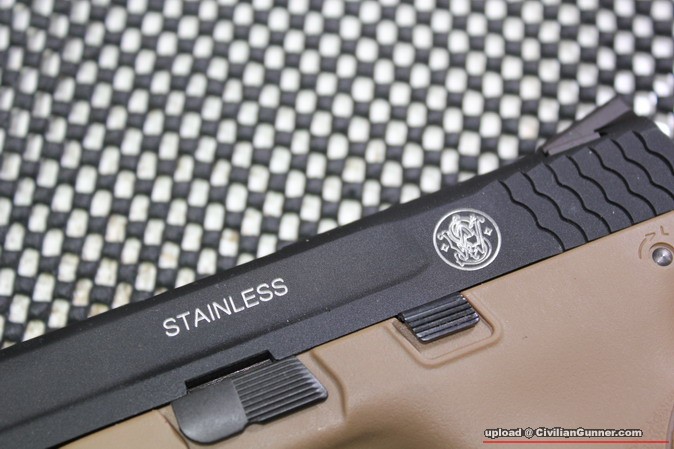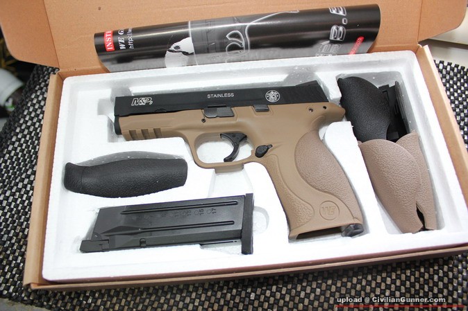 今日剛收到由台灣友台nako大特製的深刻Full Marking M&P9 ,槍連運費大約!!!%,由包裝到成品都可以看到nako大的用心 ,至於握柄marking,看來短時間內也找不到合適的,所以特地在"醫悲"bid了一個Pachmayr出品給M&P9用的軟膠套,蓋了難看的"商標".另由於我之前已買了黑色無marking版,所以今次選了沙色.Marking原本是銀色(刻後的原色),我自己再用Gun Bule染成黑色
