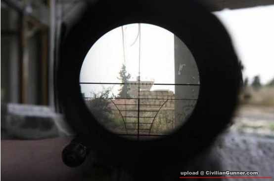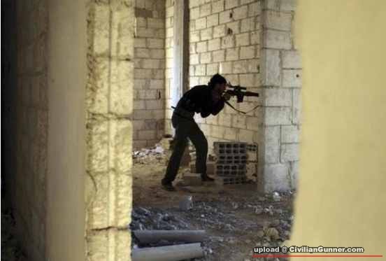 自由敘利亞軍薩迪克連隊的一名士兵正用狙擊步槍向敘利亞政府軍士兵開火。