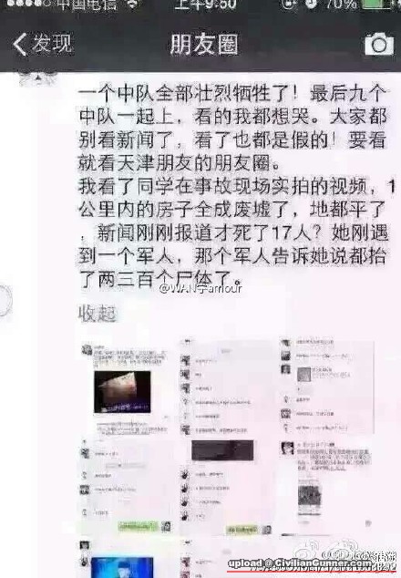網路出現一些微博或私下聊天的截圖,有網民透露稱:我爸在泰達醫院有認識的醫生,現在普通群眾死了482人,重症監護室還有52人沒有脫離生命危險;消防大隊被覆沒將近四個大隊。