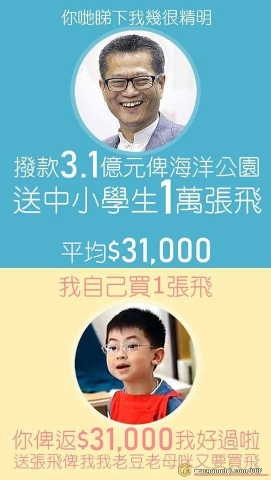 而個人感覺 如果佢肯資助海洋公洋 其實同時也可以預留多3.1億元為港人提供每人一串魚旦