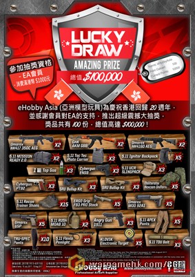 eHobby asia (亞洲模型玩具) 為慶祝香港回歸20週年,並感謝會員對EA 的支持 ,推出超級震撼大抽獎,獎品共100份 總值高達 港幣$100,000