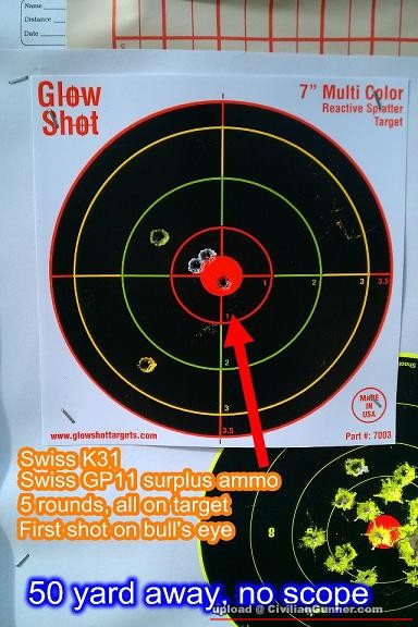 然後用支 Swiss K31,嘩,準到不得了,第一排子彈已經中紅心,我冇諗過自己用 iron sight 都可以中到,個 grouping 可以咁靚。支槍 1934 年出廠,79 歲了,支彈就係 1982 年 surplus,31 歲了。