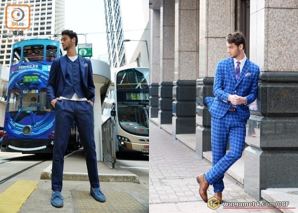 左:藍色牛仔布三件頭西裝、白色針織上衣、灰色圖案袋巾/右:彩藍色格仔西裝套裝、白色恤衫、紫色菱格紋領 ...
