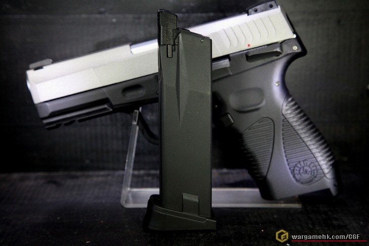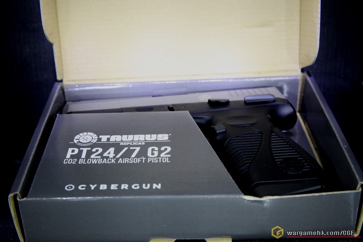 Cybergun近年在Co2槍市場上頗進取的, 先後出了很多特別款式的手槍, 這次的"Taurus PT24/7 G2"也是其中之一. 今天在"天糖"以(#)入手. 其實從包裝已經看得出是"Cybergun"的出品了........灰色盒子印上槍支外觀, 已成為他們的標誌, 盒內除了槍支本體, 另外還有可更換的握把片兩塊, 分別是"S"及"L"供選擇. 滑套上的刻印應該是鐳刻的, 握把上的金年座標誌非常仔細, Slide Stop, Magazine Release及Safety也是左右手可用, 這差不多是現代手槍的標準配置, 彈匣為正常尺寸, 不再是幼幼的彈匣, 裝彈數為19發6mm. 測試過一瓶Co2可射6個彈匣的彈數, 十分省氣, 試射手感不錯, 非常硬的回鏜彈弓, 用上Co2推動, 令Blowback強勁紮實, 射擊力度方面, 大約是1.5J. 這支"Taurus PT24/7 G2"可說是我近期比較滿意的一支Co2手槍