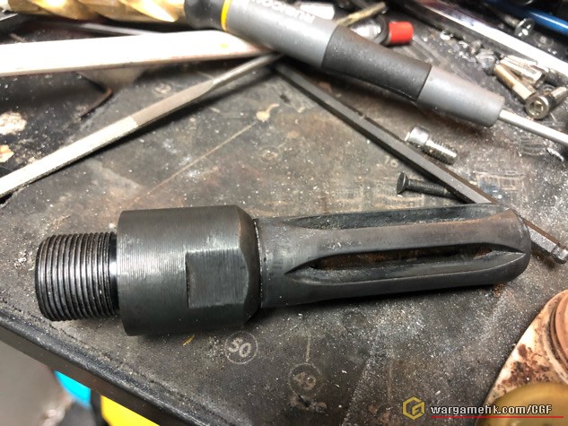 這次改裝有三個難題:頂蓋,火帽及Gas Regulator,因不想觸犯法例,所以這三件零件不可以用真品,在沒有看過真槍的情況下,Gas Regulator只好以網上圖片自行估計尺寸,上車床自己車出來,火帽也因為沒辦法入手玩具款(井勝的因為是絕版套件,不太可能獨立買到) 只好以最近似的SVD火帽去改,至於頂蓋,考慮到結構問題及需以大破壞形式去改,所以只移除魚骨及多餘物料作罷.