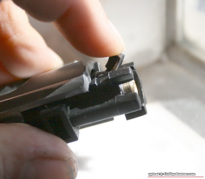 原裝彈瑴勾係用ABS膠製制,但萬一jam彈有好大機會整爆,我用了MGC glock 17的上彈膠製成,都ok架.