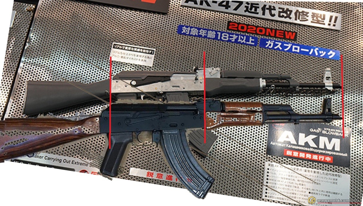 雖然兩圖角度上並不絕對相同而且有一定視差,但這個明顯的差異應該可以判斷為AK GBB 身是比例上是短一些的。