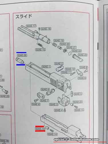 至於這三件東西功能是將膠slide 跟 「內骨架」鎖死,現在不脫出是因為marui 膠slide 有一定彈性,咬住左個內frame,不知可捱多久但隨時可以散開。
