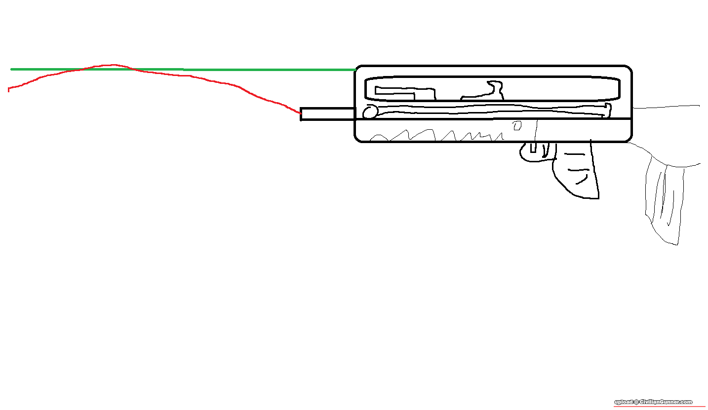 咁如果抬高少少至鏡橋成水平, 咁槍管就係向上斜, 就會做到好似上面幅圖咁粒彈向上拋
