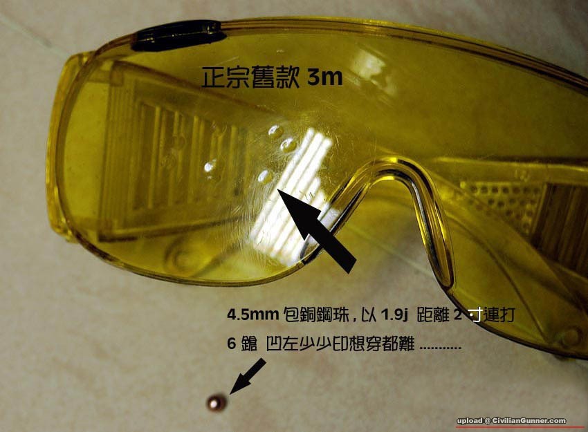 3M工業用護眼鏡型號為NO.1611(每個有原裝膠袋),現在多數為無色全透明, 戴眼鏡亦可用,防護力:1.9J 4.5MM 5CM距離鋼珠彈打凹少少印,當R痕.......