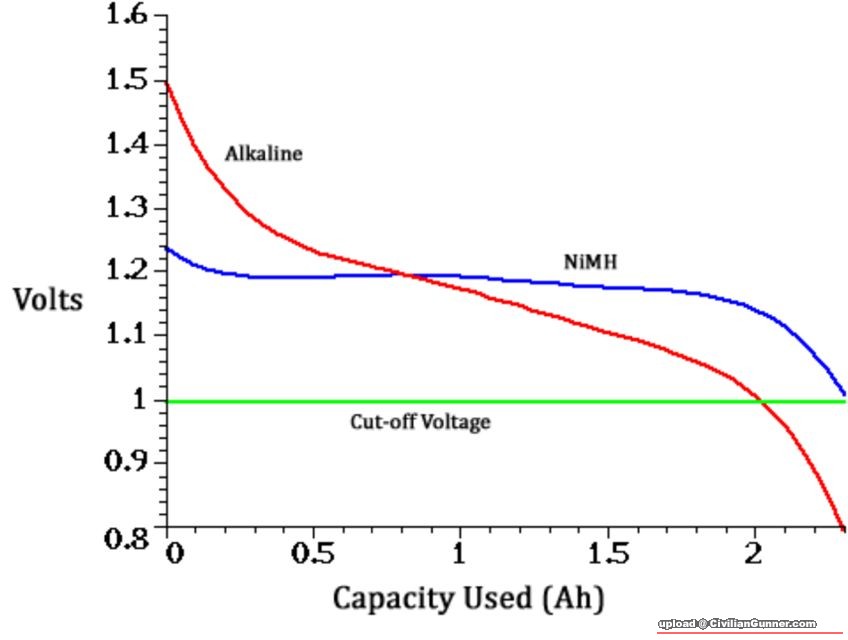 我認為最大分别你放电嘅模式. 鹼性电池時電壓斜線下降, 唔似得充电池條discharge curve 相對平好多.