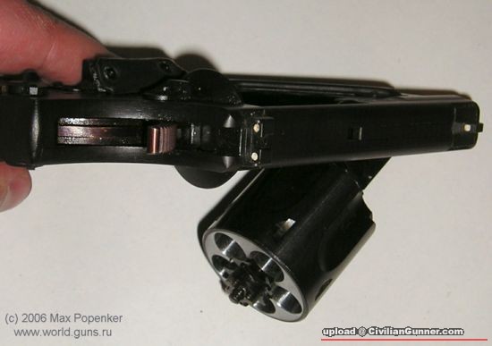 The gas sealed cylinder, mentioned above, was made to use all of powder gases to propel the bullet (in most revolvers some gases escape from the gap between the cylinder face and barrel breech). To achieve that, the cylinder moves ahead a bit when hammer is cocked, enclosing a barrel breech area with recess in the front of each chamber. The cartridge, unique to that design, had long case with tapered mouth and a bullet totally enclosed inside the case. When cylinder moves forward, the cartridge case mouth entered the barrel breech and was used as additional seal. This was a complicated mechanism, useful mostly when guns were used with silencer.