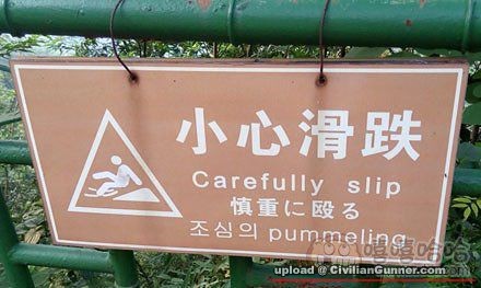 看到這塊警告牌之後,中國人小心地通過。英國人小心地躺下。日本人隨後慎重地毆打已經躺下了的英國人。韓國人表示看不懂。。。。。。