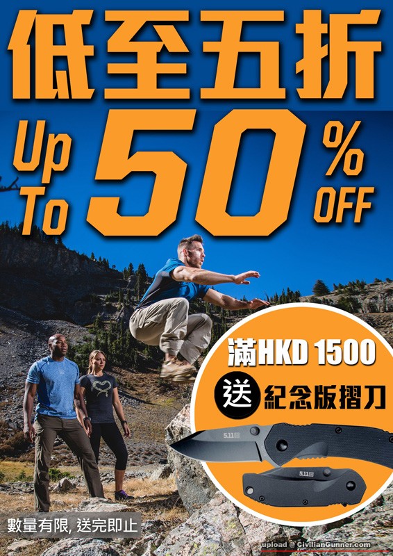 - 凡購買5.11 貨品滿HKD$1500, 送紀念版摺刀