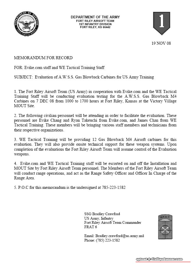 Wa~區區一隊Airsoft Team就可以出封有國防部蓋章嘅邀請函,仲用埋美國肯薩斯州(Kansas)Fort Riley陸軍的Victory Village MOUT(Military Operations on Urbanized Terrain)巷戰訓練中心作詳測。不愧稱為自由國家.....