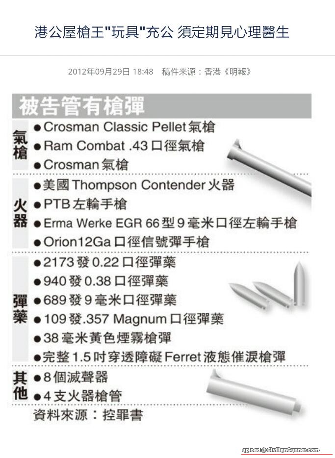 原帖由 rho837 於 27-10-2012 00:21 發表 聽街上啲人講,係真係假我唔知!求其吹下水講story!佢所有有牌既真槍全部收藏入警察認可既鐡櫃之內,其他(所謂幾百支)既槍支通通都係一般本地廣華街買到既玩具槍,而新聞講所謂四仟粒子彈!應該全 ...