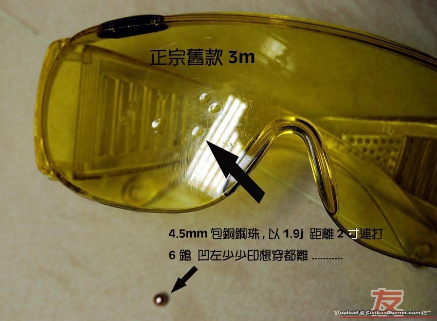 原帖由 T-800 於 7-12-2011 14:31 發表 3M工業安全鏡(正牌果d )HK$3x 有隻!1.9J 4.5mm(0.35g)鋼珠1尺(0.3公尺)打埋去絕對唔穿、唔裂!(少少凹咗....) 不過唔防霧,自己噴野.....軍醫叔用咗幾年咯! Ps:有黃色同透明(無色)比您揀 ...