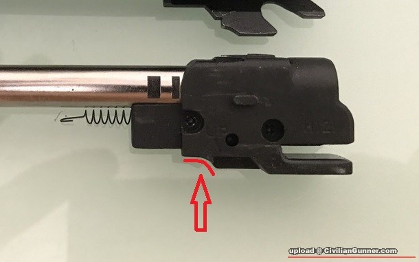 起HOP UP座底部有個弧形位( 較HOPUP 輪前面), 貼一片電線膠布,  令個孤位更貼更配合拆槍LEVER 條芯, 減少上下虛位