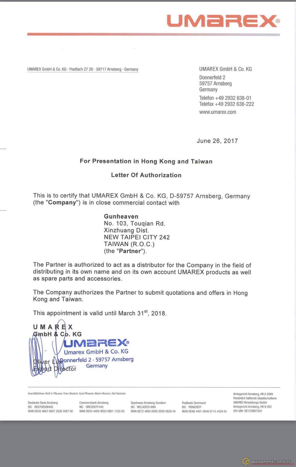 原帖由 queen 於 2017-9-30 14:32 發表 Relationship between Umarex & 槍X堂..... Copy from 戰X王 FB ☆公告 Announcement 根據德國Umarex集團來電要求,為避免坊間傳聞造成消費者與同行業者之困擾,特提供原廠授權文件,以證明「槍X堂」(Gun H ...