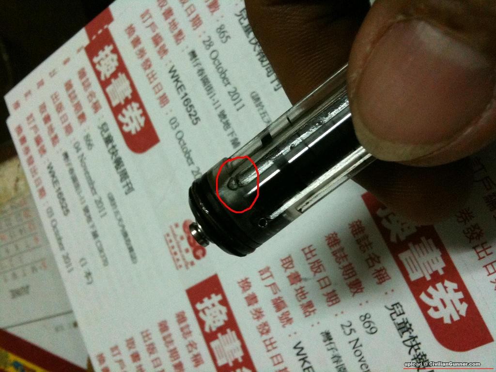 我用 A 牌透明飛機,最初感覺超爽 ,但打了約二十匣後發覺個 bolt set 不能完全回後,拆出來研究,發覺飛機兩邊的軌道尾位竟然「披」了!( 圖中紅色圓圈位置 ) 因此引致飛機不能在銅 bolt 筒內暢順地郁動。現時我只好用幼沙紙將「披」起的部份磨平,但呢個只係屬於急救的方法。亦明白到此飛機將命不久矣!
