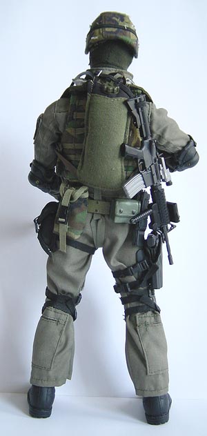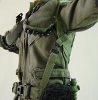 | The above is a AAV body armor of the Full Spectrum Battle Equipment system (FSBE) of USMC. This body armor is MOLLE compatible. This AAV(known as the Amphibious Assault Vest and made by Point Blank) is designed to be used with the Small Arms Protective Insert (SAPI). (The SAPI protects against 3 rounds of 7.62X51 M80 ball at the muzzle.) The AAV weighs approximately 6.5 pounds in size medium, and the SAPI an additional 3.5 pounds each. The vest is comfortable and allows greater mobility for the operator. |